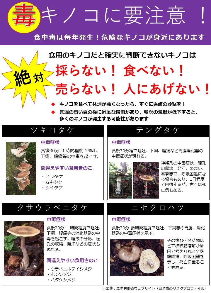 \秋の味覚キノコに注意!!/毒キノコを誤って食べたことによる食中毒が、堺市内でも発生しました。食用と確実に判断できないキノコは採らない!食べない!売らない!人にあげない!体調が悪くなったら、すぐに医師..