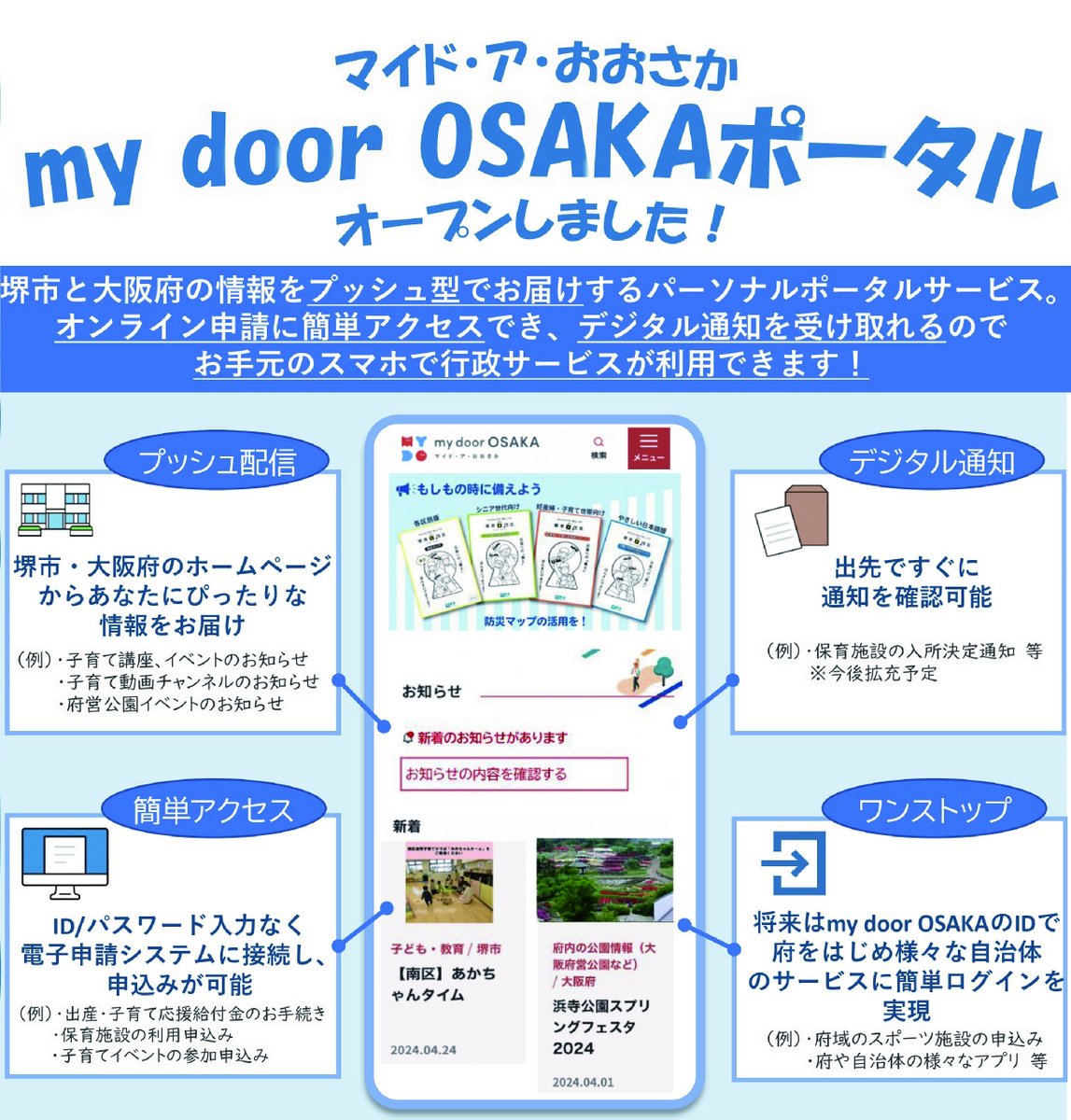 あなたに合った行政サービスにつながるmydoorOSAKA行政手続きがワンストップで完結できるデジタル窓口がスタート保育施設の入所申請される方が登録すると、申請から結果通知までスマホで完結します堺市民..