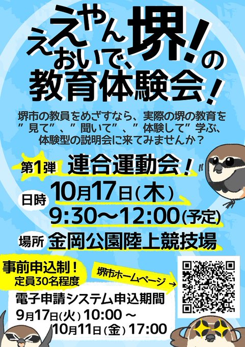 【申し込み期限迫る!】堺の教育体験型の説明会「ええやん堺!おいで、堺の教育体験会!」の第1弾「連合運動会編」の参加申し込みは、10月11日(金)17時までです!実際の堺の教育の取組を見学するチャンスで..