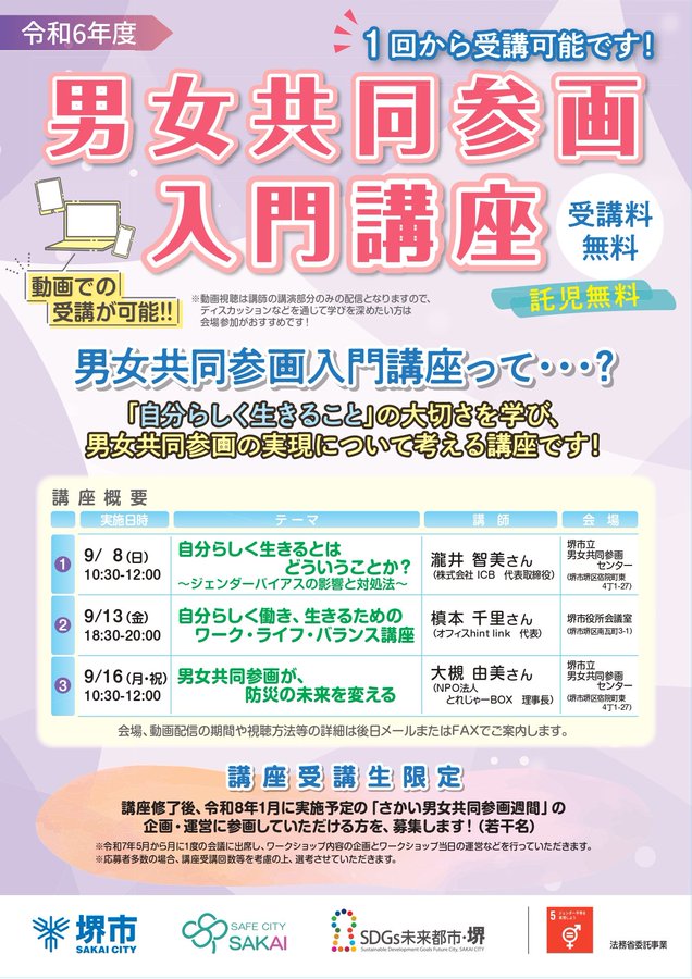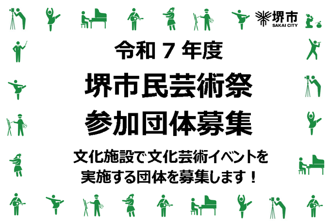 令和7年度堺市民芸術祭参加団体を募集美術、茶華道、文芸、劇、音楽などを披露しませんか?受付は令和6年10月18日㊎まで。文化芸術の秋を楽しみましょう!イベント日程:令和7年10~11月のうち指定の日会..