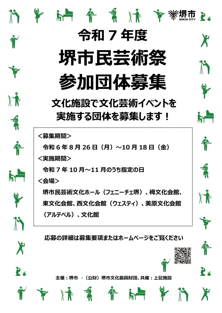 「令和7年度堺市民芸術祭」の参加団体を募集します!募集受付は令和6年10月18日(金)まで。みんなで文化芸術の秋を楽しみましょう!【イベント実施期間】令和7年10月~11月のうち指定の日【会場】フェニ..