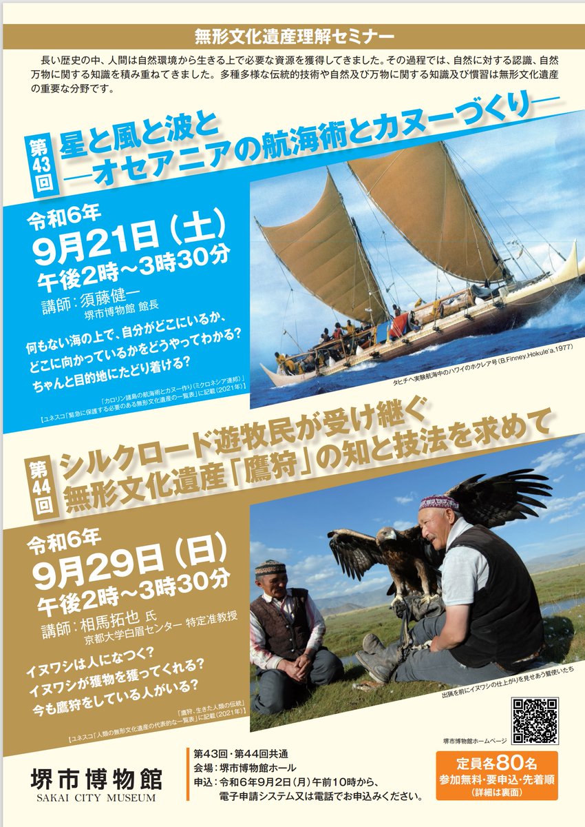 世界各地の無形文化遺産を知ろう!セミナーを堺市博物館で開催!■9/21(土)星と風と波と―オセアニアの航海術とカヌーづくり―■9/29(日)シルクロード遊牧民が受け継ぐ無形文化遺産「鷹狩」の知と技法を..