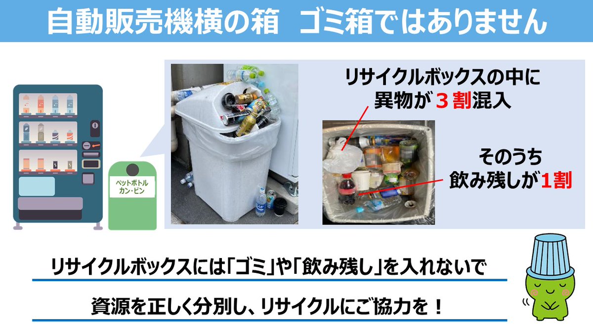 自動販売機横の箱は、飲み終わった『空』の容器だけを回収するリサイクルボックスです!全国にあるボックス実は、プラカップや飲み残しのある容器など、リサイクルできないごみが3割を占めています!ごみはごみ箱へ..