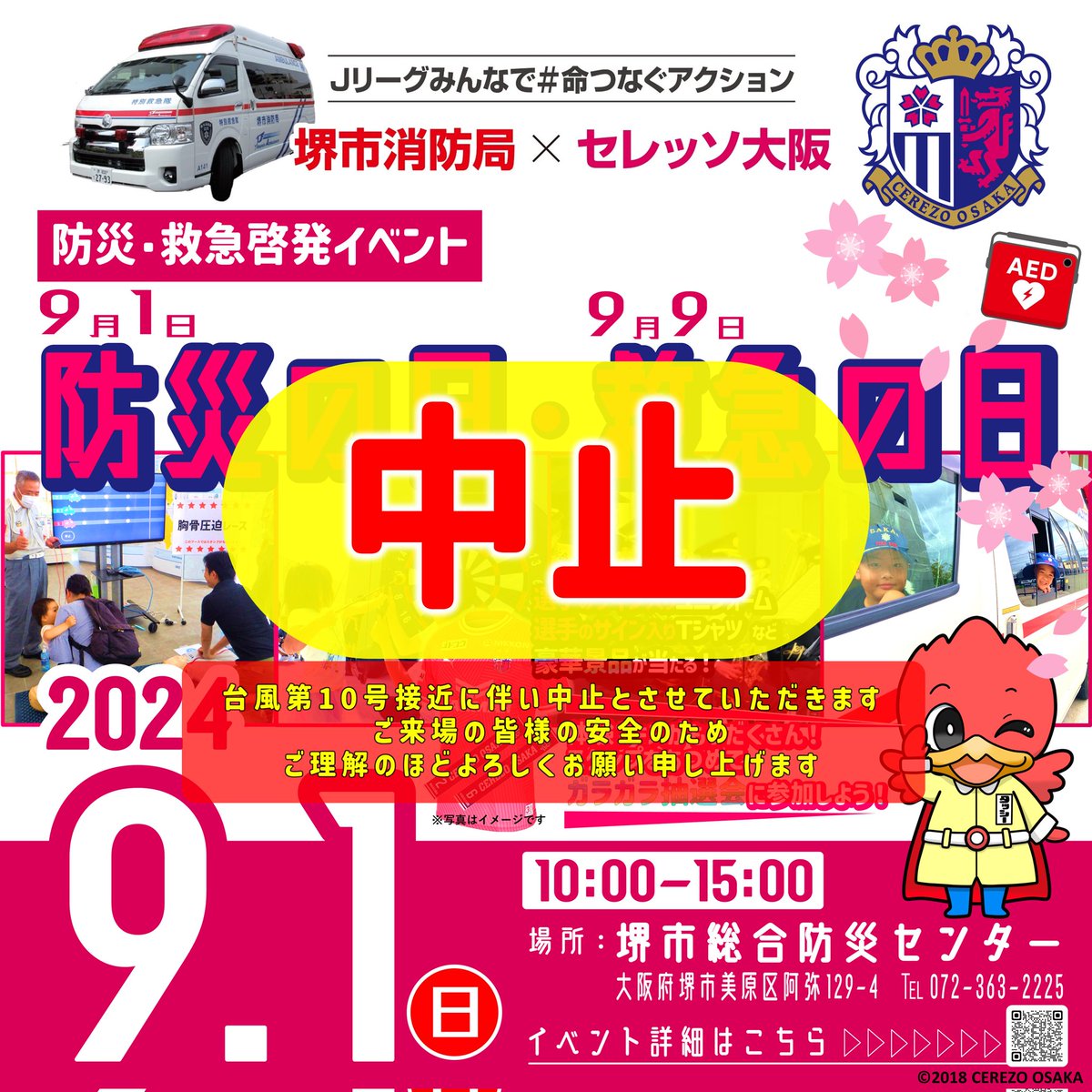 【イベント中止のお知らせ】 9月1日に堺市総合防災センターで開催予定であった #堺市消防局 × #セレッソ大阪 「防災の日・救急の日」イベントは、台風10号の影響が出る恐れがあることから、誠に残念ですが中止とさせていただきます