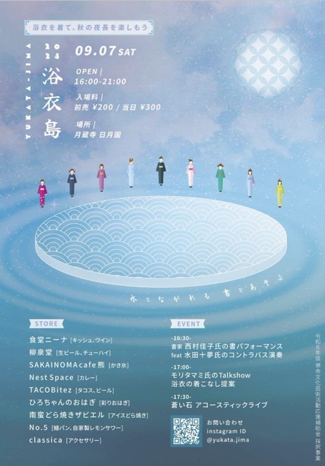 令和6年度堺市文化芸術活動応援補助金の採択事業のご紹介今回は「【浴衣島】水とながれる書とあそぶ」です【日時】9月7日(土)16時〜21時【場所】月蔵寺日月園【入場料】前売200円当日300円浴衣を着て..