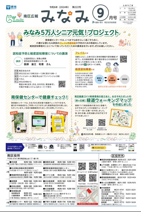 みみちゃんです広報みなみ9月号を発行!1面ではみなみ5万人シニア元気!プロジェクトについてお知らせ♪南区ホームページからも見られるよお手元に届いていない場合は0120-222-472(宅配業務受託業者..