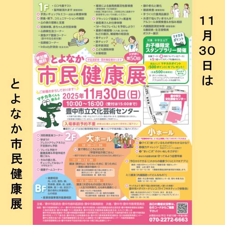 とよなか市民健康展を11月30日(日)10時~16時で開催します。講演・展示・測定・体験等、子どもから大人まで健康について楽しく学べて、お子様(中学生以下)対象のスタンプラリーも!ぜひご参加ください。..