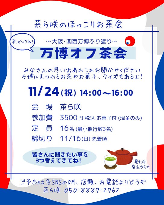 茶ら咲のほっこりお茶会、今回は「万博オフ茶会」です各SNSからのご予約も開始しました「2回しか万博行ってないけどいいかしら…」とか「私が行っても大丈夫?」など心配されている方がちらほらいらっしゃるので..