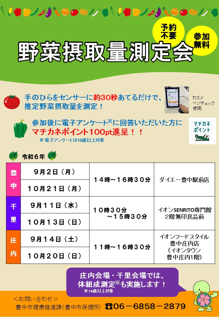 野菜摂取量測定会のご案内9月2日(月)14時~16時30分にダイエー豊中駅前店にて野菜摂取量測定会を開催します。手のひらを約30秒センサーにあてるだけで推定野菜摂取量を測定します。電子アンケート回答者..
