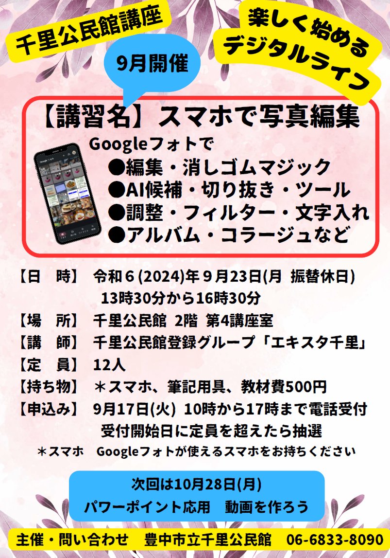 #千里公民館です。「楽しく始めるデジタルライフ」開催のお知らせ日時:9月23日(月・振替休日)13時30分~16時30分まで申込:9月17日(火)10時から電話にて千里公民館まで詳しくは市ホームページ..