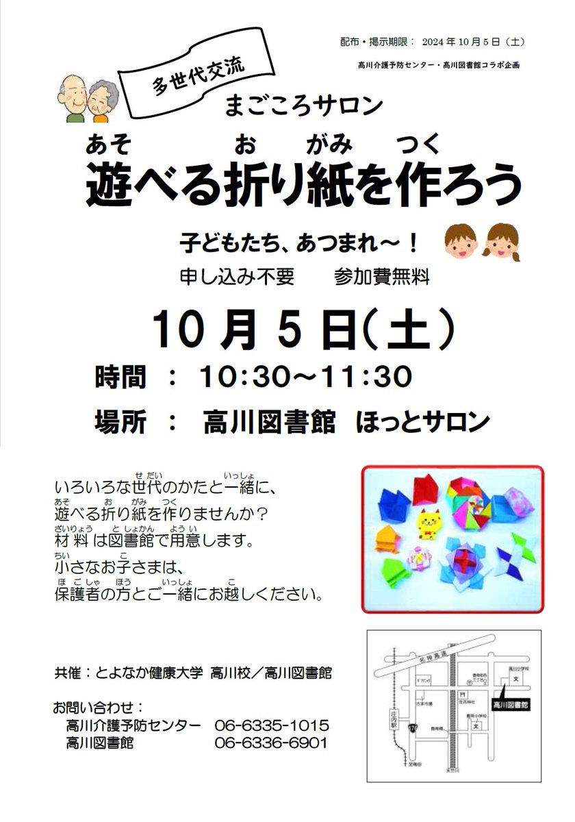 高川図書館です。遊べる折り紙を作ってみませんか?10/5(土曜)10時半~11時半に「遊べる折り紙を作ろう」というイベントを開催します!申し込みは不要。当日、高川図書館のほっとサロンにお越しください♪..