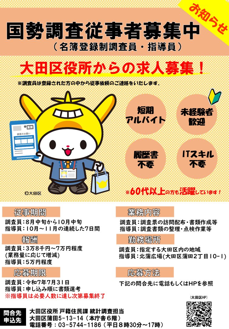 【国勢調査従事者募集中】 令和7年は国勢調査が実施されます。現在調査員と指導員を大募集中、未経験の方も大歓迎です。調査員は7月31日まで、指導員は定員に達するまで募集します。業務内容や報酬などの詳細はHPをご覧ください。 HPはこちら⇒ http://city.ota.tokyo.jp/kuseijoho/suuji/toukei_chousa/tourokutyousainboshuu.html…