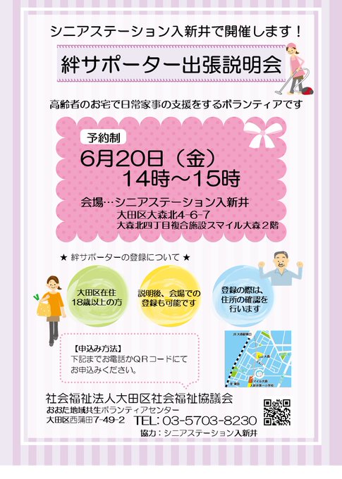 来月出張説明会を開催することとなりましたスマイル大森にて6/20(金)14:00~15:00に開催します何かボランティアしてみたいな、自分にも出来るボランティアがあるかなと思っている方にお勧めですお話聞きにきませんか?ご参加をお待ちしております #大田区 #ボランティア #大田区社協