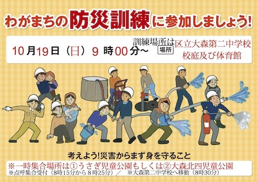 わがまちの防災訓練に参加しましょう! 開催日時:令和7年10月19日 9時00分〜訓練場所:区立大森第二中学校校庭及び体育館 ※一時集合場所は ①うさぎ公園 もしくは ②大森北四児童公園※点呼集合受
