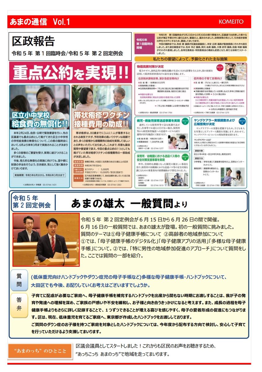 私の区政報告として #あまの通信 を作成しました😁😁第一号です!
