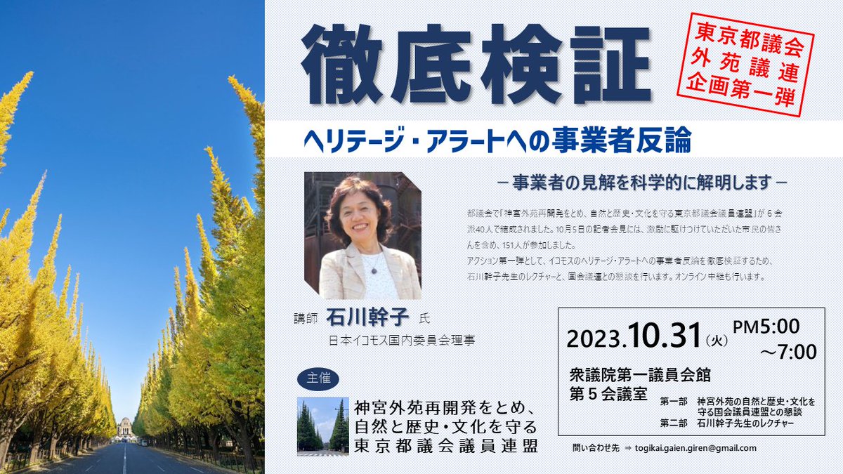 【神宮外苑再開発とめる❗】 🌲外苑イチョウ並木は守られるのか? 🌲樹木保全対策は? 日本イコモスのヘリテージ・アラートへの事業者反論について、専門家の #石川幹子 先生を講師にお呼びし、徹底検証を行います! 市民のみなさんもぜひ、お越しください。