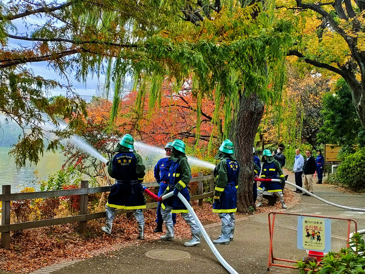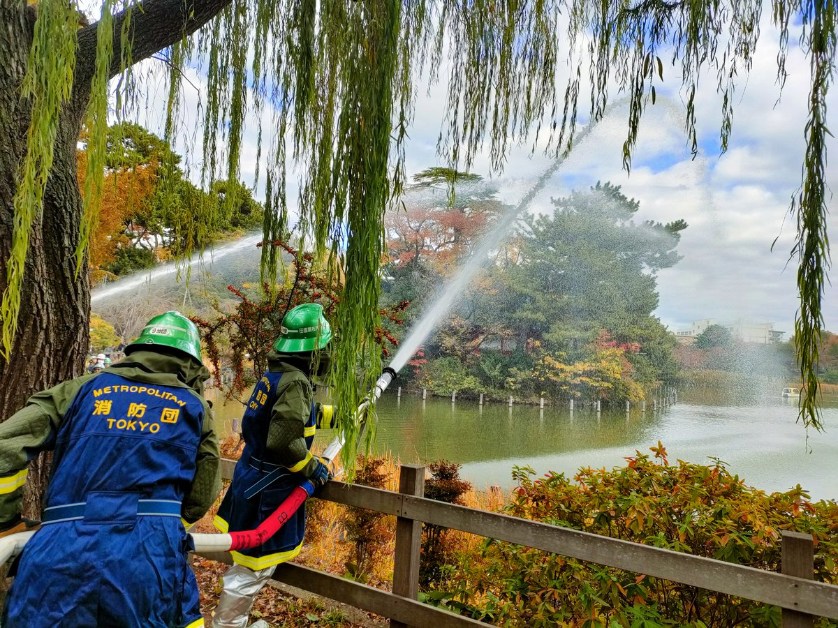 午後は #洗足池公園 で行われていた田園調布消防署消防震災訓練を拝見しました🧯 災害時にホースを何本も連結させる必要があることを想定しての訓練のため、広い洗足池公園で行われたそうです。 珍しい光景にお散歩中の方など、多くのギャラリーがいらっしゃいました。