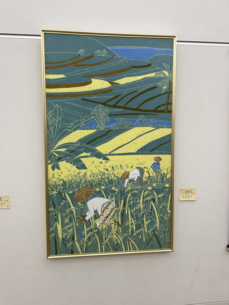 先週、#日展 で今年も入賞したジャカルタ駐在時の友人、平岩智子さんの #バティック を #ジャカルタ の駐在友だちで見に行った。 今年の色合いは明るい色調で 、#バリ島 の棚田の様子が細部まで描かれていた。 あの頃はずいぶん前になったけど楽しい思い出話はつきない! 平岩さんは大田区在住❤️