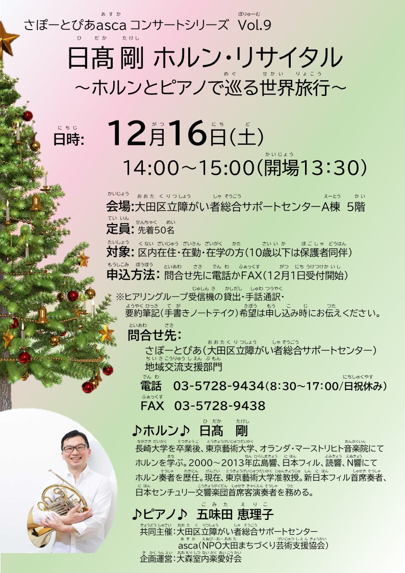日髙剛ホルン・リサイタルを12/16にさぽーとぴあで開催。「世界旅行」をテーマにした、ホルンとピアノの音色を楽しんでみませんか?障がいのある方もない方も、一緒に音楽を聴いて楽しめるクラシックコンサートです。詳細はこちら↓