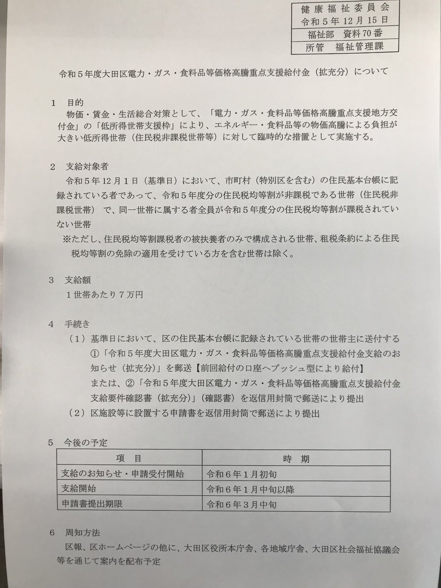 大田区 補正予算で計上した、非課税世帯への給付金7万円の支給の予定。