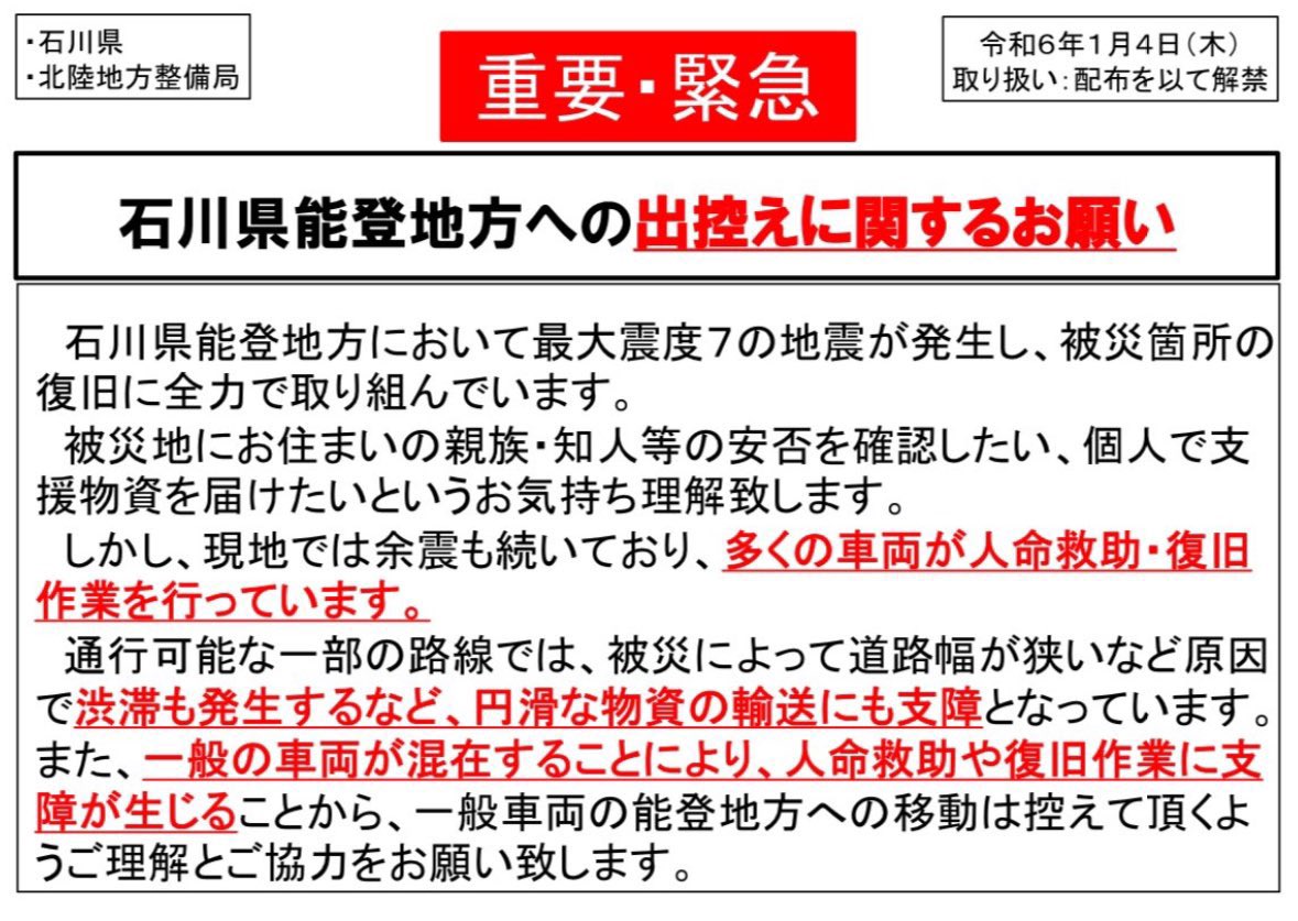 #能登半島 #不要不急 #移動 #救援部隊 #地震 #令和6年能登半島地震 twitter.com/hase3655/status/..