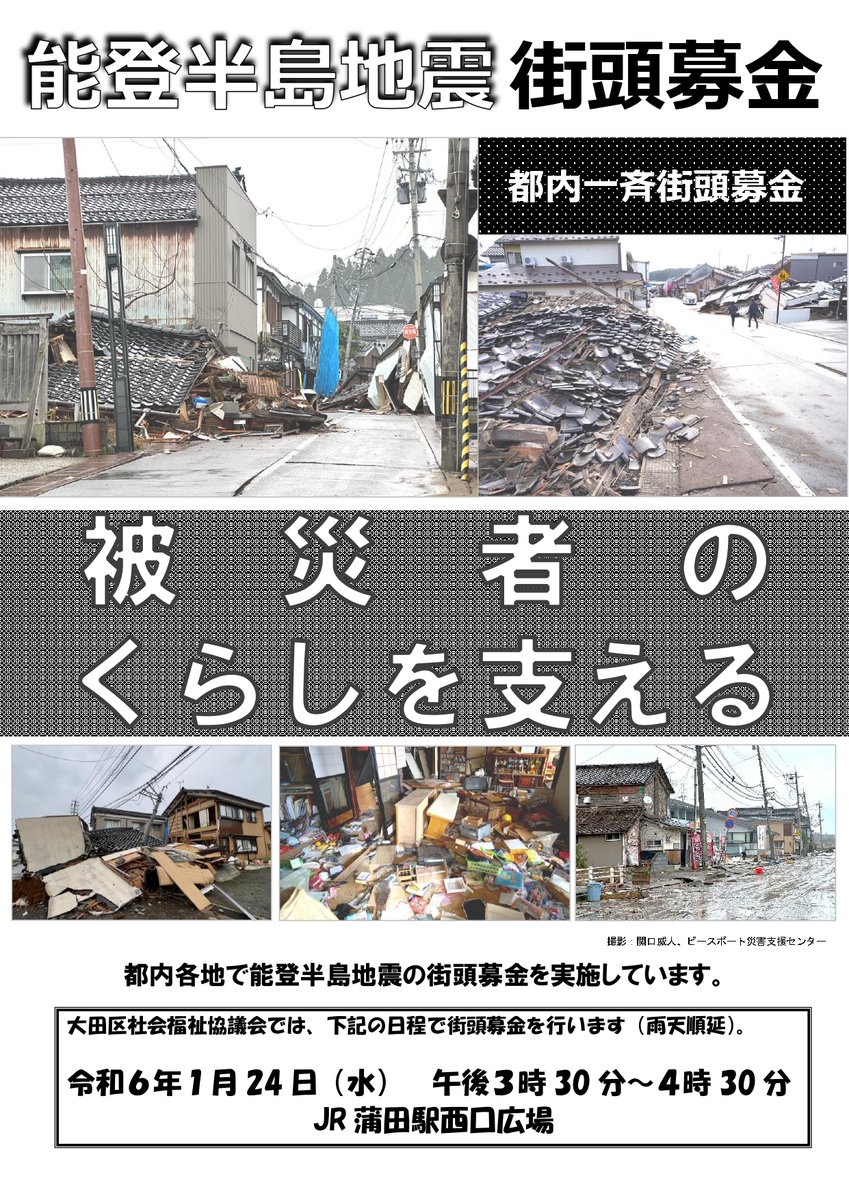 令和6年1月1日に発生した能登半島地震を受け、大田区社会福祉協議会では下記日程で街頭募金を実施いたします。