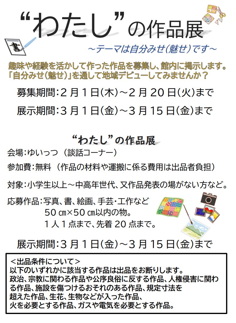 わたしの作品展 作品募集のお知らせ🌟 詳細は添付資料をご確認ください。 応募方法:作品をゆいっつ受付に提出 皆さんのご応募お待ちしております☺️ #ゆいっつ #大田区 #平和島 #地域交流 #作品展 #趣味 #特技 #自分魅せ #フォローよろしくお願い致します