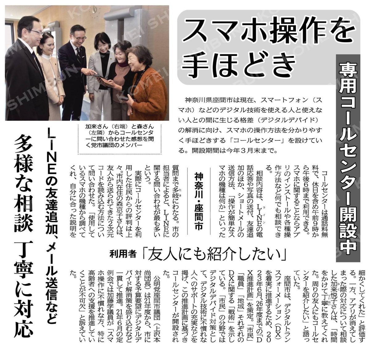 スマホ操作を手ほどき/専用コールセンター開設中/神奈川・座間市 #公明新聞電子版 2024年02月10日付 www.komei.or.jp/newspaper-app/