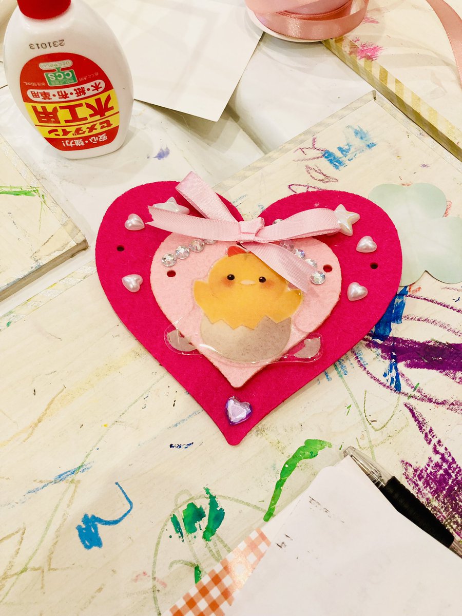 「まねっこおかお」を歌ったり、いりやまさんのパステルを使ったステンシルの画法の作画実演の後、ハートのアクセサリー作りをして楽しみました。動くぴよちゃんの登場に皆さんにっこり🐥