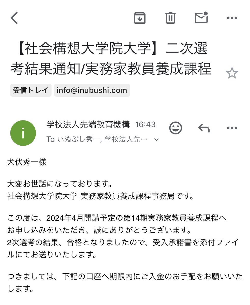 【社会構想大学院大学実務家教員養成課程合格】 文科省が進める実務家教員養成の一環として、開始された実務家教員養成課程に応募いたしましたところ、昨日、無事合格のお知らせをいただきました。 放送大学大学院以来の学舎への復帰は、ドキドキ、ワクワクしています。 #mics_pr