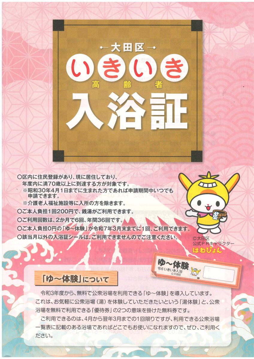 令和6年度、大田区いきいき入浴証の申し込みが始まりました♨️