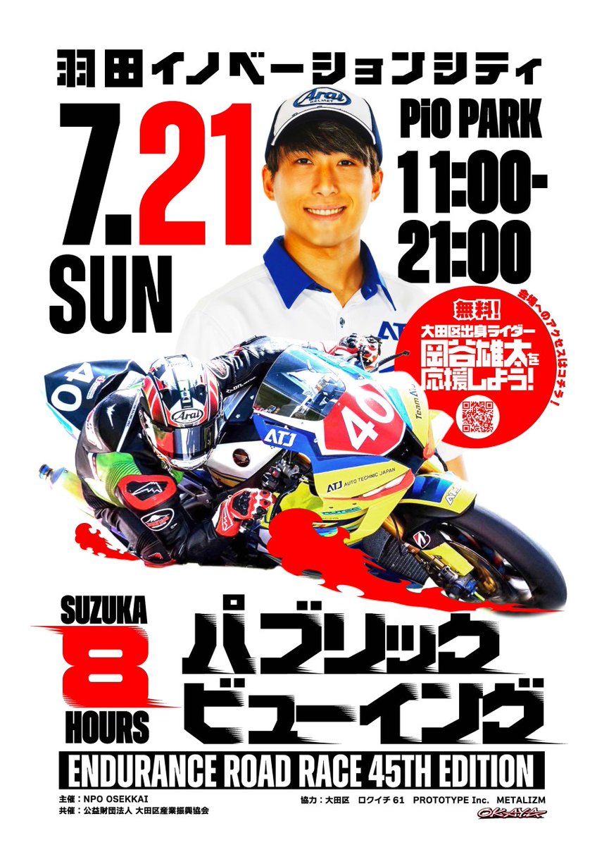 大田区出身ライダー #岡谷雄太 選手出場! 羽田イノベーションシティのPiO PARKで、鈴鹿サーキットで開催される8時間耐久ロードレースのパブリックビューイングが実施されます入場無料です! #uniqueota #大田区 #羽田イノベーションシティ #バイク #パブリックビューイング #羽田空港