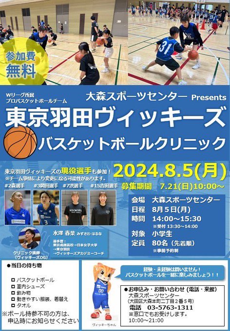 【ヴィッキーズ クリニック情報】 #大森スポーツセンター にて小学生を対象とした バスケットボールクリニックを開催します。プロ選手や資格を持ったコーチが直接指導します まだ定員に多少の余裕があります。ご興味のある方はお早めにお申し込みください! 8/5 14:00~15:30 対象:小学生男女