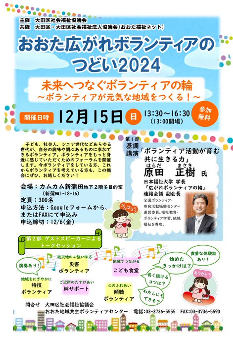 12/15(日)「おおた広がれボランティアのつどい2024」開催 第1部 基調講演 #日本福祉大学 学長 #原田正樹 先生 第2部 #こども食堂 羽田のこのこ食堂、 #災害ボランティア 小野紀之氏、絆サポーター、傾聴ボランティア、特技ボランティア登壇 申込https://docs.google.com/forms/d/e/1FAIpQLSe2mDawBULVuohuU4krF3N7tDVy5EJC377M8y5Jd7O23Nyx0g/viewform?vc=0&c=0&w=1&flr=0… #大田区 #社