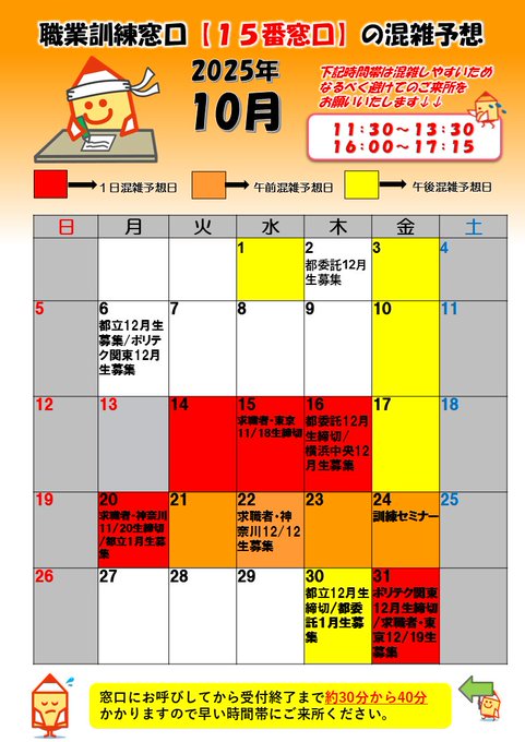 10月職業訓練窓口の混雑予想について10月の職業訓練窓口【15番窓口】の混雑予想です窓口にお呼びしてから、受付終了まで約30〜40分かかりますので、早い時間帯にご来所ください。ハローワーク大森HPht..