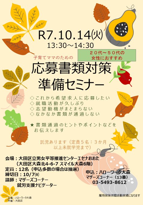 #ハローワーク大森#マザーズコーナー子育てママのための応募書類対策準備セミナー開催!!10/14(火)13:30〜(締切10/7)会場:#エサナおおた託児あり詳細はハローワーク大森HPhttp://j..