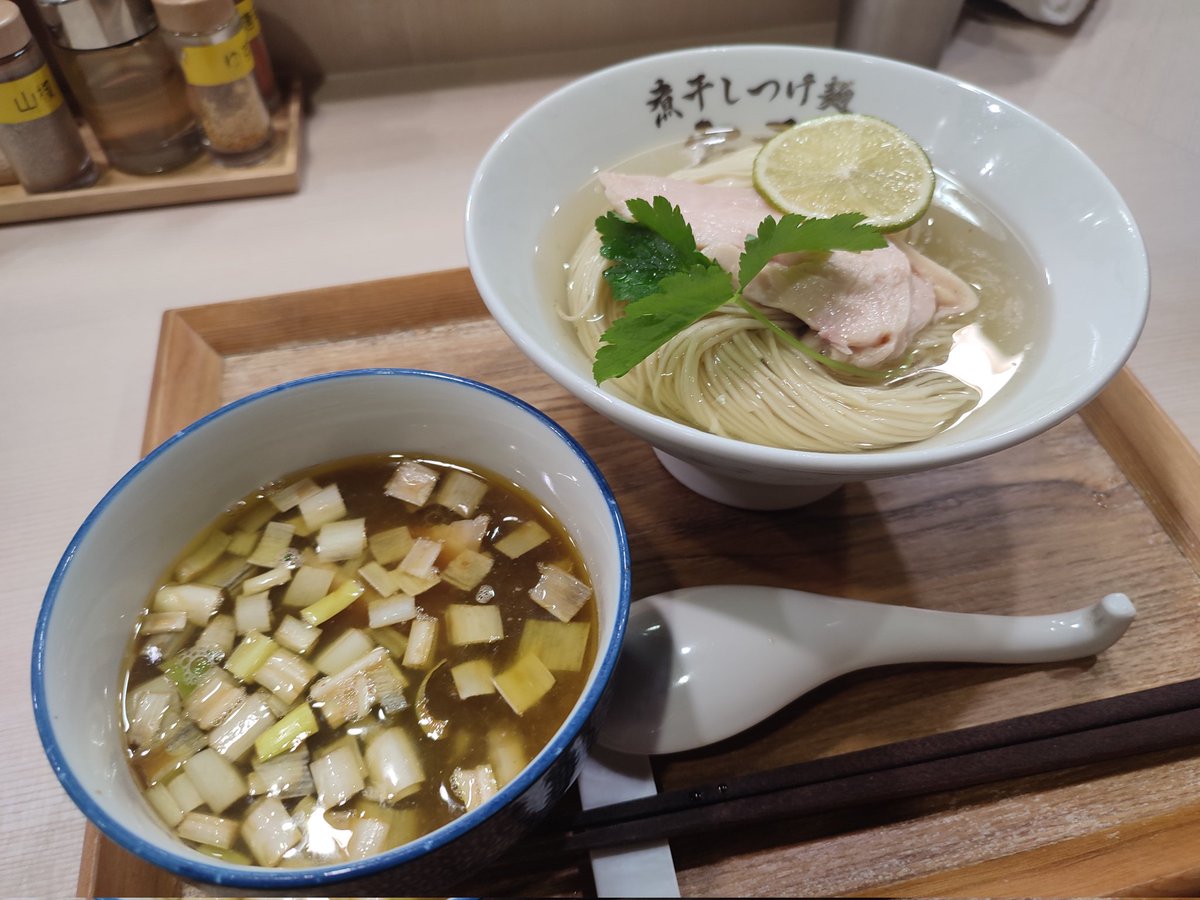 ラーメン探訪『煮干しつけ麺宮元』蒲田限定 特製地鶏としじみの昆布水つけ麺(塩)地鶏の旨味と十三湖産の蜆の後味が融合した濃密なつけ汁、尖りが無い塩も絶妙🤣👌👍雲呑は売り切れもバラ吊るしと鶏レアチャ絶品💯..