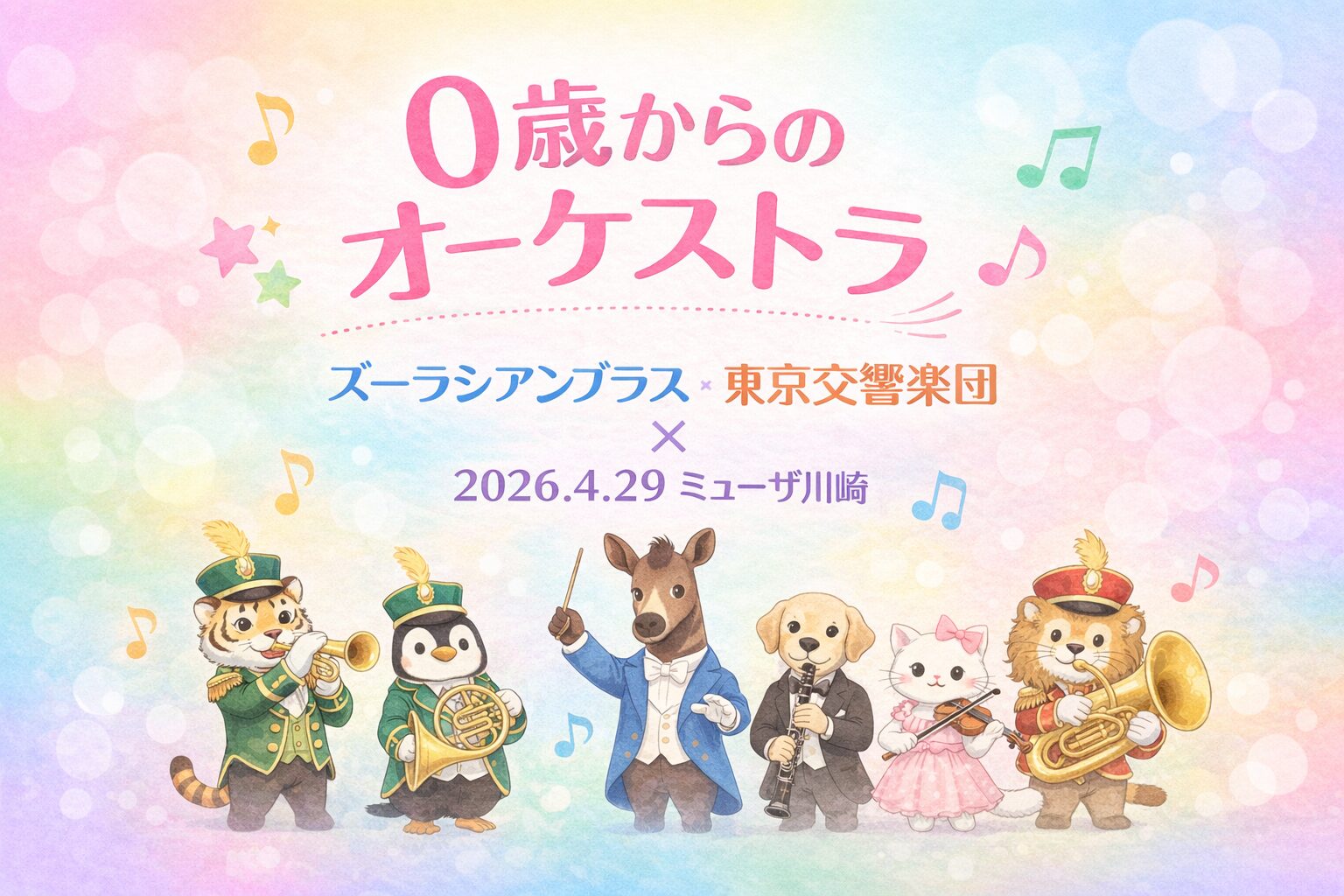 2026年4月29日、ミューザ川崎で開催。0歳から楽しめる親子向けオーケストラ公演。ズーラシアンブラスと東京交響楽団が共演。料金・アクセス情報も紹介。