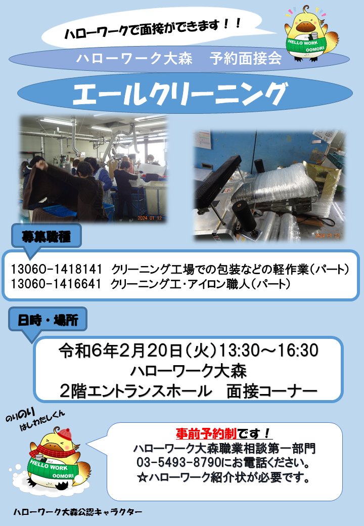 2月20日にエールクリーニング予約面接会をハローワーク大森にて開催いたします 事前予約制必ず窓口・お電話にてお取り合わせください *クリーニング工場での包装などの軽作業 *クリーニング工・アイロン職人..