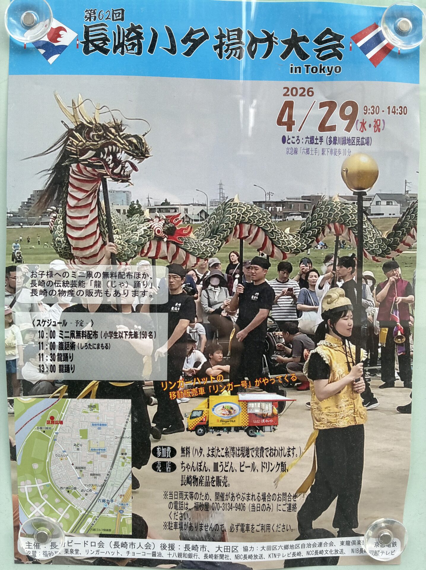 【六郷土手】4/29(水・祝)多摩川緑地区民広場で長崎の春の風物詩である「長崎ハタ揚げ大会in東京」が開催されます。「伝統芸能の龍(じゃ)踊り」「ハタ上げ」や長崎名物「長崎ちゃんぽん」などの販売が行わ..