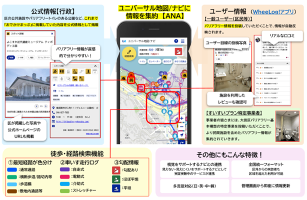 これまで「おでかけまっぷ」にて発信してきた公共施設等のバリアフリー情報に加え、利用者等により書き込まれる民間施設のバリアフリー情報や、経路検索機能等を一元的に集約するため、全日本空輸株式会社(ANA)が提供する「ユニバーサル地図/ナビ」を試験的に導入します。