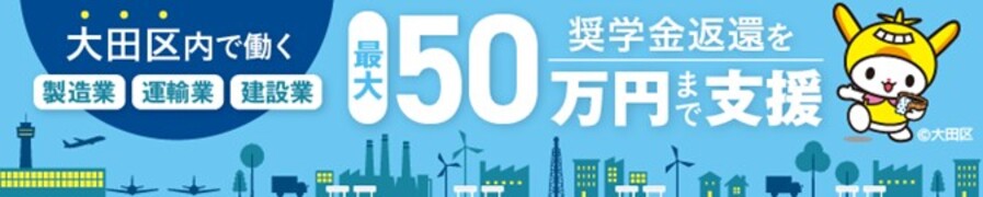 大田区内の中小製造業・運輸業・建設業に就職した方に対して奨学金返還額の半額(上限10万円/年)を最長5年間分(60か月分)50万円まで支援します。