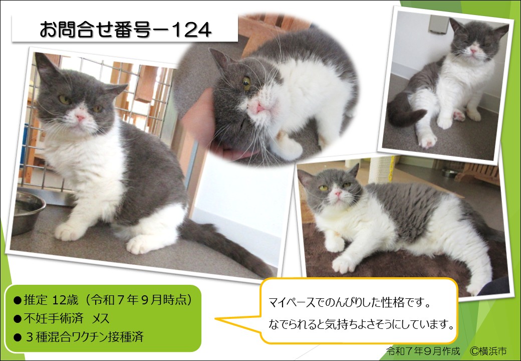 新しく、灰白の猫(お問合せ番号-124)が譲渡対象になりました 譲渡動物情報は、随時更新しています。ご興味のある方は、是非ご覧ください 譲渡動物情報《猫》 https://city.yokohama.lg.jp/kurashi/sumai-kurashi/pet-dobutsu/aigo/joto/jotoinfo-cat.html…