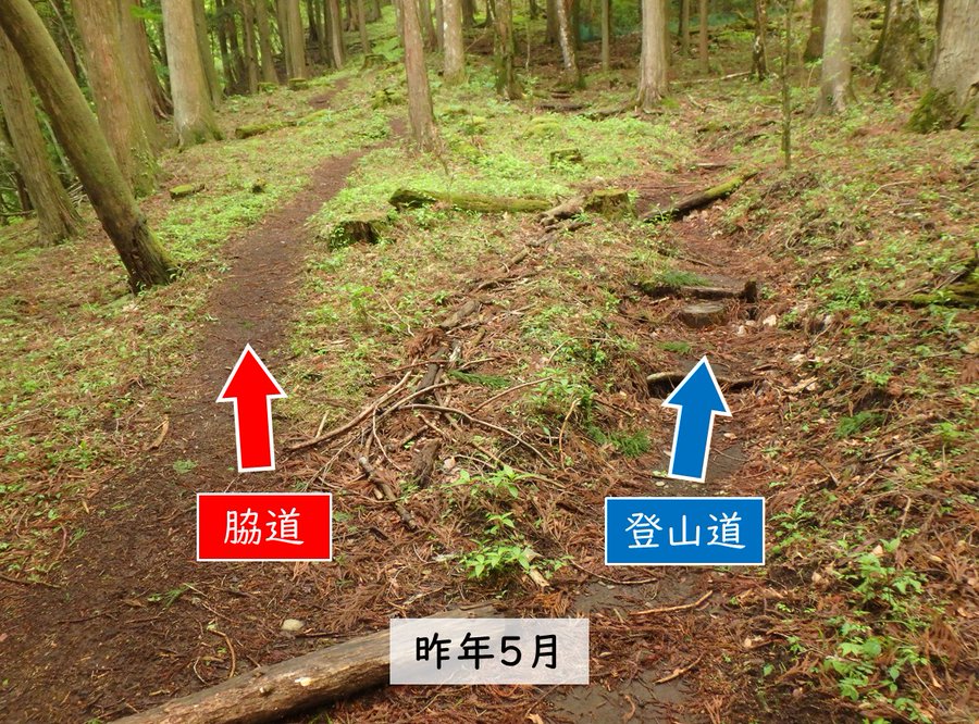 登山道を外れて歩くと脇道ができて植生が衰退します。堂平のこの場所では、脇道ができる度に枝などで塞いできました。昨年11月にボランティアと協働で塞いだ箇所は植物が芽生え、回復のきざしが見えてきました。h..