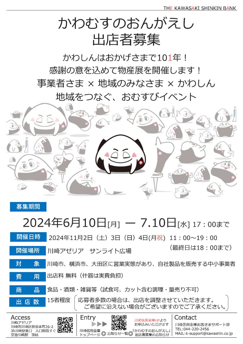【出店者募集!】川崎アゼリア物産展「かわむすのおんがえし」2023年に川崎信用金庫は100周年を迎えました地域貢献及び#地域活性化のため、地元川崎へのおんがえしイベントを11月2日(土)から4日(月・..