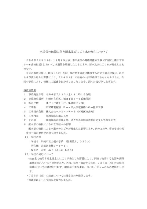 本日11時15分頃、本市発注の電線路撤去工事において、水道管を破損したことにより、断水及びにごり水が発生し、市立土橋小学校の明日の給食の一部が提供できなくなりました。皆様にご迷惑をおかけしましたことを..