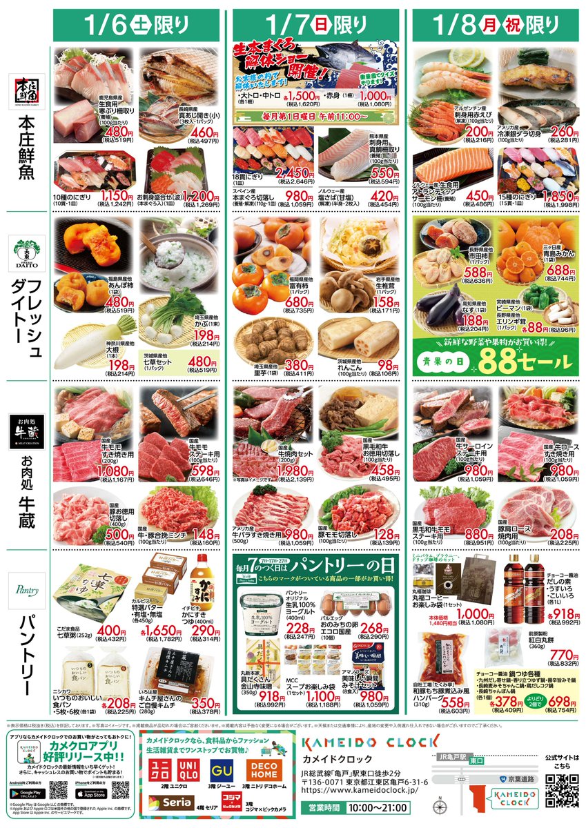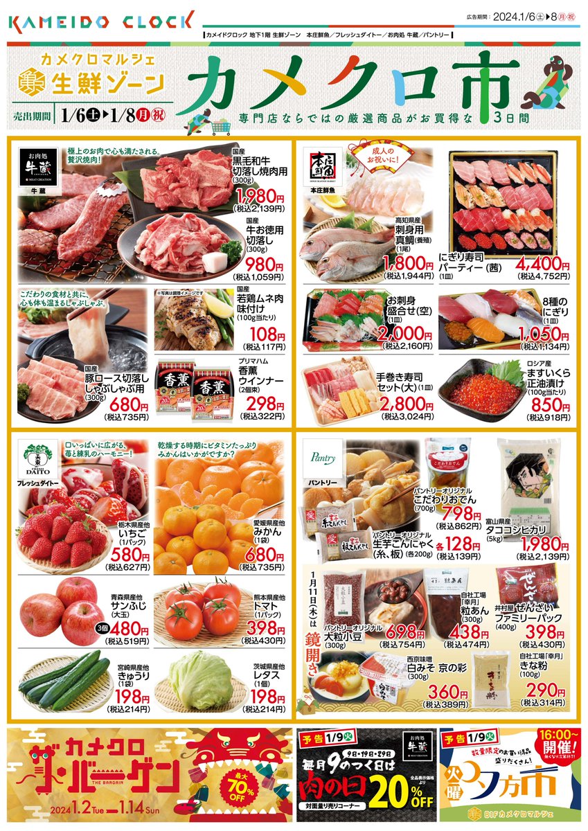 【🍎1/6(土)~1/8(月)🐟】#カメクロ市 が開催! 「お肉処牛蔵、本庄鮮魚、フレッシュダイトー、パントリー」各店自慢の商品が盛りだくさんです!!見逃せない3日間✨ 今週末は #カメクロマルシェ へ🐢 詳細はチラシをご確認ください☟☟☟ #亀戸 #カメイドクロック