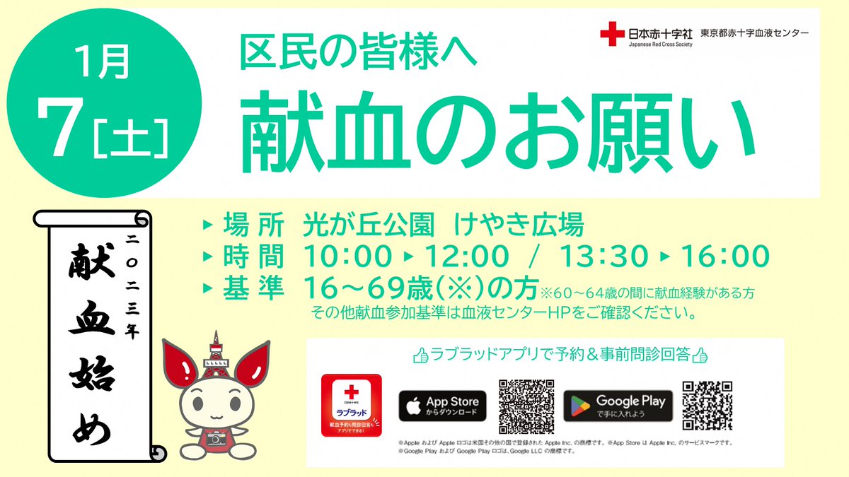 【献血のお願い】1/7(土)、献血を実施します。2023年練馬区の献血は光が丘からスタートです🌳■会場 光が丘公園体育館前■時間 10時~16時献血カードの代わりにもなるスマホアプリ誕生✨予約はもちろ..