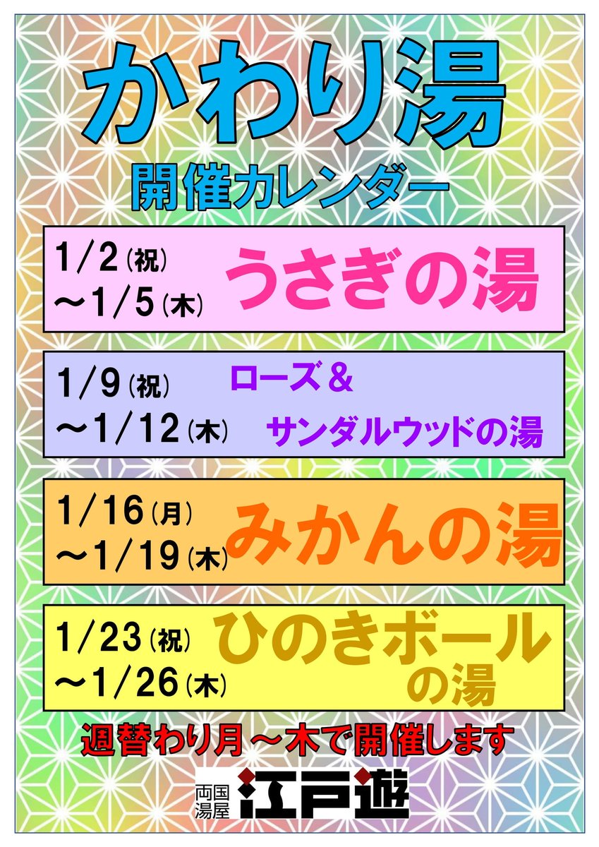 男女上がり湯では毎週月~木曜に かわり湯を開催しています♨ 季節・催事やハーブ・アロマ系など 色々な種類のものをご用意しております! ゆっくりお湯に浸かってお楽しみください(*'ω'*)