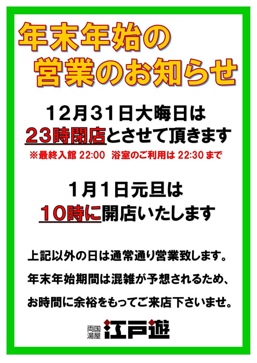 本日12/31(土)大晦日は、誠に勝手ながら23:00閉店とさせて頂きます。※浴室・岩盤浴のご利用は22:30まで、最終入館は22:00となります。🍽お食事処営業時間12:00~22:00(21:30..